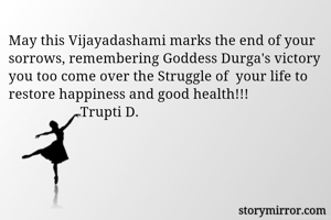 May this Vijayadashami marks the end of your sorrows, remembering Goddess Durga's victory you too come over the Struggle of your life to restore happiness and good health!!! Trupti D.