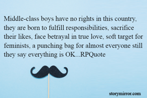 Middle-class boys have no rights in this country, they are born to fulfill responsibilities, sacrifice their likes, face betrayal in true love, soft target for feminists, a punching bag for almost everyone still they say everything is OK...RPQuote