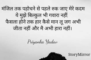मंजिल तक पहोचने से पहले रुक जाए मेरे कदम ये मुझे बिल्कुल भी गवारा नहीं, फैसला होने तक हार कैसे मान लू जग अभी जीता नहीं और मै अभी हारा नहीं। Priyanka Yadav