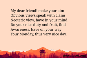 My dear friend! make your aim Obvious views,speak with claim Neoteric view, have in your mind Do your nice duty and fruit, find Awareness, have on your way Your Monday, thus very nice day.