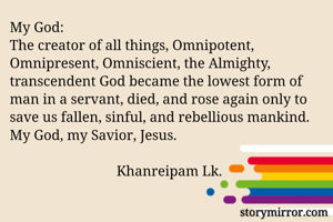 The creator of all things, Omnipotent, Omnipresent, Omniscient, the Almighty, transcendent God became the lowest form of man in a servant, died, and rose again only to save us fallen, sinful, and rebellious mankind. My God, my Savior, Jesus.