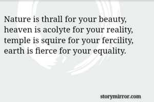 Nature is thrall for your beauty, heaven is acolyte for your reality, temple is squire for your fercility, earth is fierce for your equality.
