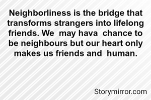 Neighborliness is the bridge that transforms strangers into lifelong friends. We may hava chance to be neighbours but our heart only makes us friends and human.