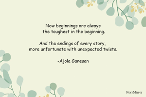 New beginnings are always the toughest in the beginning. And the endings of every story, more unfortunate with unexpected twists. -Ajola Ganesan