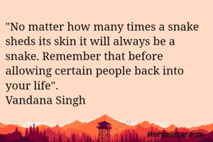 "No matter how many times a snake sheds its skin it will always be a snake. Remember that before allowing certain people back into your life". Vandana Singh