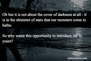 Oh but it is not about the cover of darkness at all - it is in the shimmer of stars that our monsters come to bathe. So why waste this opportunity to introduce me to yours?