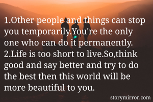 1.Other people and things can stop you temporarily.You're the only one who can do it permanently. 2.Life is too short to live.So,think good and say better and try to do the best then this world will be more beautiful to you.