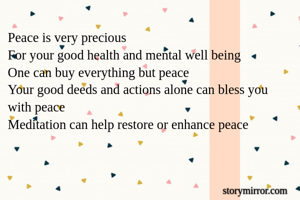 Peace is very precious For your good health and mental well being One can buy everything but peace Your good deeds and actions alone can bless you with peace Meditation can help restore or enhance peace