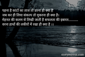 पहना है कांटों का ताज तो डरना ही क्या है जब कर ही लिया संकल्प तो मुकरना ही क्या है। मेहनत की कलम से लिखी जाती है सफलता की इबारत........... वरना हाथों की लकीरों में रखा ही क्या है ।।