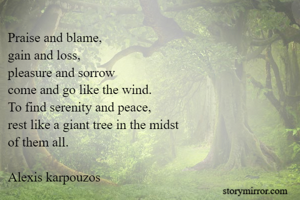Praise and blame, gain and loss, pleasure and sorrow come and go like the wind. To find serenity and peace, rest like a giant tree in the midst of them all. Alexis karpouzos