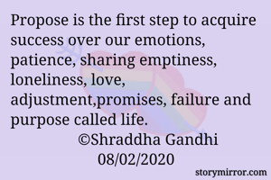 Propose is the first step to acquire success over our emotions, patience, sharing emptiness, loneliness, love, adjustment,promises, failure and purpose called life.
