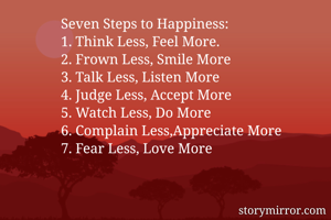 Seven Steps to Happiness: 1. Think Less, Feel More. 2. Frown Less, Smile More 3. Talk Less, Listen More 4. Judge Less, Accept More 5. Watch Less, Do More 6. Complain Less,Appreciate More 7. Fear Less, Love More