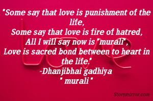 "Some say that love is punishment of the life, Some say that love is fire of hatred, All I will say now is "murali", Love is sacred bond between to heart in the life." -Dhanjibhai gadhiya " murali "