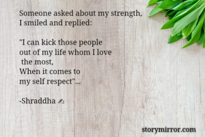 Someone asked about my strength, I smiled and replied: "I can kick those people out of my life whom I love the most, When it comes to my self respect"... -Shraddha ✍
