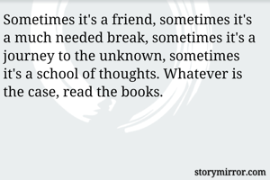 Sometimes it's a friend, sometimes it's a much needed break, sometimes it's a journey to the unknown, sometimes it's a school of thoughts. Whatever is the case, read the books.