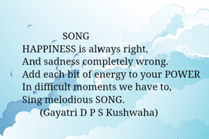 SONG HAPPINESS is always right, And sadness completely wrong. Add each bit of energy to your POWER In difficult moments we have to, Sing melodious SONG. (Gayatri D P S Kushwaha)