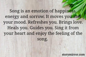 Song is an emotion of happiness, energy and sorrow. It moves you and your mood. Refreshes you. Brings love. Heals you. Guides you. Sing it from your heart and enjoy the feeling of the song.