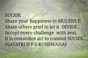 SUCIDE Share your happiness to MULTIPLY, Share others grief to let it DIVIDE. Accept every challenge with zeal, It is cowardice act to commit SUCIDE. (GAYATRI D P S KUSHWAHA)