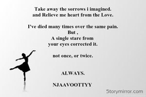 Take away the sorrows i imagined. and Relieve me heart from the Love. I've died many times over the same pain. But , A single stare from your eyes corrected it. not once, or twice. ALWAYS. NJAAVOOTTYY