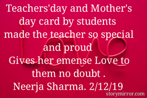 Teachers'day and Mother's day card by students made the teacher so special and proud Gives her emense Love to them no doubt . Neerja Sharma. 2/12/19