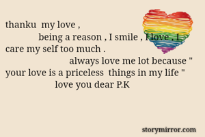 thanku my love , being a reason , I smile , I love , I care my self too much . always love me lot because " your love is a priceless things in my life " love you dear P.K