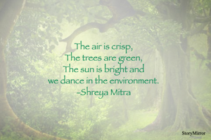 The air is crisp, The trees are green, The sun is bright and we dance in the environment. -Shreya Mitra