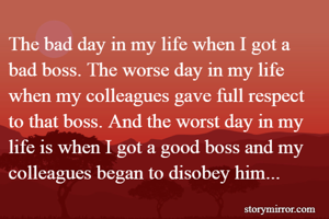 The bad day in my life when I got a bad boss. The worse day in my life when my colleagues gave full respect to that boss. And the worst day in my life is when I got a good boss and my colleagues began to disobey him...