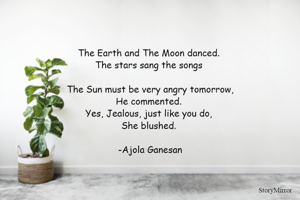 The Earth and The Moon danced. The stars sang the songs The Sun must be very angry tomorrow, He commented. Yes, Jealous, just like you do, She blushed. -Ajola Ganesan
