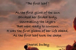 "The first leaf " As the first glint of the sun Stroked her folded body, Unraveling the layers That were ready to contour, It was the first gleam of her life ahead, As the first leaf took the shape. Sheetal Dubey