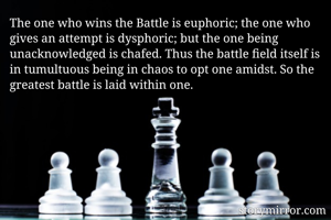 The one who wins the Battle is euphoric; the one who gives an attempt is dysphoric; but the one being unacknowledged is chafed. Thus the battle field itself is in tumultuous being in chaos to opt one amidst. So the greatest battle is laid within one.