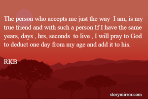 The person who accepts me just the way I am, is my true friend and with such a person If I have the same years, days , hrs, seconds to live , I will pray to God to deduct one day from my age and add it to his. RKB