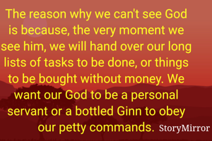 The reason why we can't see God is because, the very moment we see him, we will hand over our long lists of tasks to be done, or things to be bought without money. We want our God to be a personal servant or a bottled Ginn to obey our petty commands.