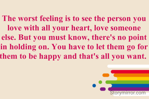 The worst feeling is to see the person you love with all your heart, love someone else. But you must know, there's no point in holding on. You have to let them go for them to be happy and that's all you want.