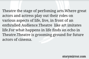 Theatre the stage of perfoming arts.Where great actors and actress play out their roles on various aspects of life, live, in front of an enthralled Audience.Theatre like art imitates life.For what happens in life finds an echo in Theatre.Theatre is grooming ground for future actors of cinema.