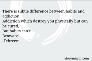 There is subtle difference between habits and addiction, Addiction which destroy you physically but can be cured, But habits can't! Beaware! -Tehreem