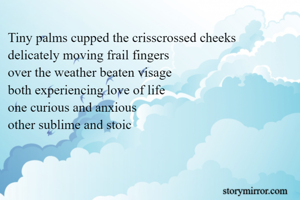 Tiny palms cupped the crisscrossed cheeks delicately moving frail fingers over the weather beaten visage both experiencing love of life one curious and anxious other sublime and stoic