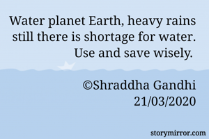 Water planet Earth, heavy rains still there is shortage for water. Use and save wisely.