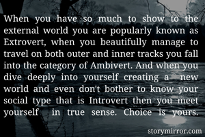 When you have so much to show to the external world you are popularly known as Extrovert, when you beautifully manage to travel on both outer and inner tracks you fall into the category of Ambivert. And when you dive deeply into yourself creating a new world and even don't bother to know your social type that is Introvert then you meet yourself in true sense. Choice is yours.