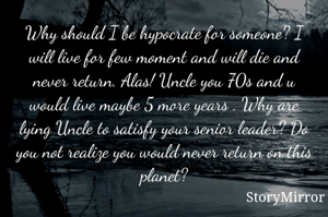 Why should I be hypocrate for someone? I will live for few moment and will die and never return. Alas! Uncle you 70s and u would live maybe 5 more years . Why are lying Uncle to satisfy your senior leader? Do you not realize you would never return on this planet?