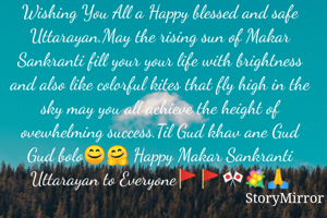 Wishing You All a Happy blessed and safe Uttarayan.May the rising sun of Makar Sankranti fill your your life with brightness and also like colorful kites that fly high in the sky may you all achieve the height of ovewhelming success.Til Gud khav ane Gud Gud bolo😊🤗 Happy Makar Sankranti Uttarayan to Everyone🚩🚩🎌💐🙏