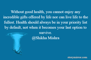 Without good health, you cannot enjoy any incredible gifts offered by life nor can live life to the fullest. Health should always be in your priority list by default, not when it becomes your last option to survive. @Shikha Mishra