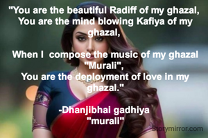 "You are the beautiful Radiff of my ghazal, You are the mind blowing Kafiya of my ghazal, When I compose the music of my ghazal "Murali", You are the deployment of love in my ghazal." -Dhanjibhai gadhiya "murali"