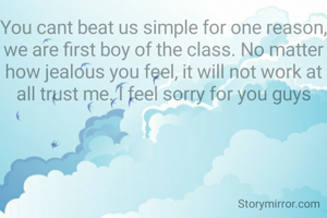You cant beat us simple for one reason, we are first boy of the class. No matter how jealous you feel, it will not work at all trust me. I feel sorry for you guys