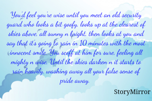 You'd feel you're wise until you meet an old security guard who looks a bit goofy, looks up at the clearest of skies above, all sunny n bright, then looks at you and say that it's going to rain in 10 minutes with the most innocent smile. You scoff at him for sure, feeling all mighty n wise, Until the skies darken n it starts to rain heavily, washing away all your false sense of pride away.