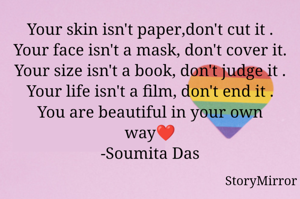 Your skin isn't paper,don't cut it . Your face isn't a mask, don't cover it. Your size isn't a book, don't judge it . Your life isn't a film, don't end it . You are beautiful in your own way❤️