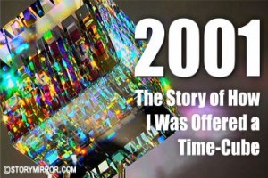 But the story doesn't end there. A few years later I took my imaginary time-cube to a "time-travelers convention" at MIT where I was almost arrested for claiming that I went back in time three years. Perhaps without the time-cube it would not have been possible. That occasion and other events are recorded in my forthcoming (eventually) book, The Dimensional Time-Traveler's Toolkit, the most professional resource I predict will be available for those who wish to time travel with their minds.