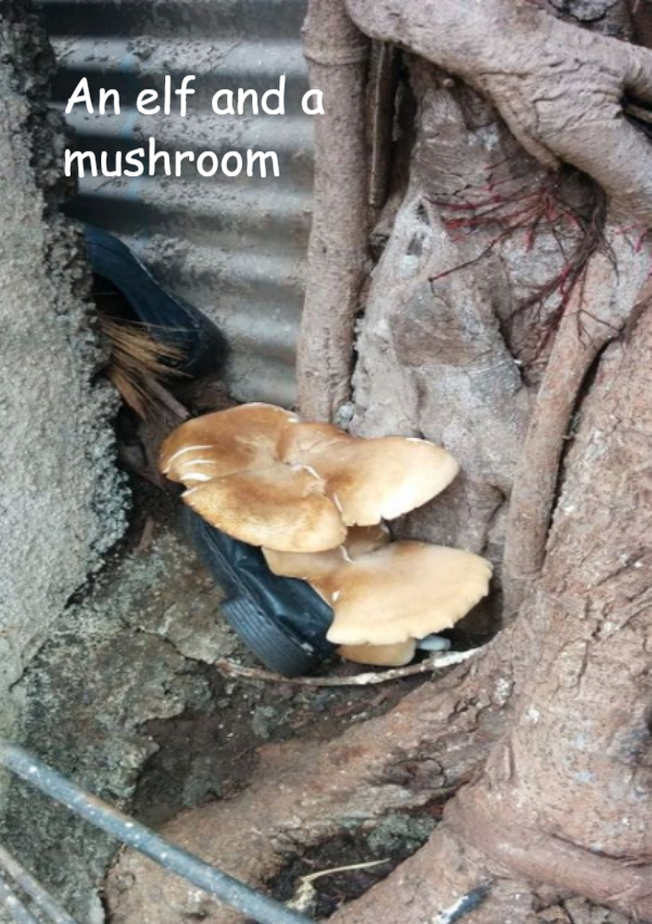 It was the rainy season. The elf saw a mushroom growing near his shoe house. He thought it would be wonderful idea if the mushroom grew big enough to provide him some shelter from the pouring rain.