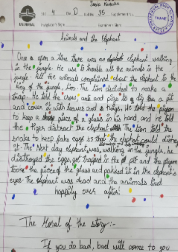 Once upon a time, there was an elephant walking in the jungle. He used to trouble all the animals in the jungle. All the animals complained about the elephant to the King of the jungle Lion. The lion decided to make a trap, he told the crow, ants and pigs to dig a huge pit and cover it with leaves and twigs. He told the pigeon to keep a piece of glass in his hand and told the tiger to distract the elephant. The lion told the snake to keep fake eggs so that the elephant could try to destroy it and fall into the pit. The next day elephant was distracted by the tiger, he destroyed the eggs, got trapped in the pit and the pigeon took the piece of glass and poked it in the elephant's eyes. The elephant was dead and animals lived happily thereafter.