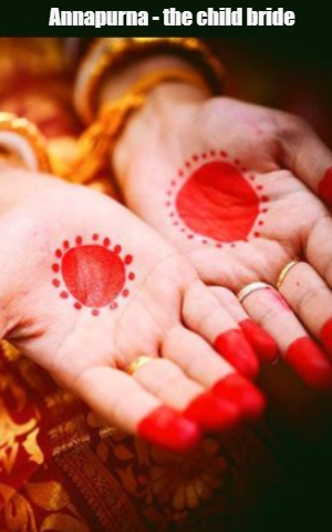 "Annapurna! Annapurna! Where are you?"- pisima's voice could be heard in the entire house. Everyone heard her except the one who was called for. Perched on the highest branch of the mango tree of their courtyard, little Annapurna was happily eating mangoes. "Uff! Who made these mangoes so tasty! They may be God's favourite fruit too.!" - she thought dangling her tiny feet coloured with Alta. "Naughty child. Come down this instance!" - bellowed pisima from under the tree sweating profusely. It was the peak of summer in Bengal which meant the Sun God would shine with all his glory on the top of one's head. Annapurna climbed down the tree with the swiftness of a squirrel. "Ishh! Look at you so filthy. Is this how you are going to look in front of your in-laws?" said pisima carrying Annapurna in her arms. "Do they also have mango trees in their courtyard pisima?". Pisima laughed hearing the innocent question of the child.