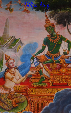 an Asura named Virasena attacked Kubera, however, Lord Shiva Nad Lord Vishnu were unable to defeat him. Vishnu told Kubera to seek the help of the king Dilip, who came to Kubera's mythical city of Alaka. Dilip fired arrow after arrow at Virasena, but every drop of blood spilled caused the formation of a new Virasena. To finish the unending battle, Dilip prayed to the goddess Raktesahwari who came and drank all the blood of Virasena, allowing for his death. King Dilip was a noble, popular ruler who was married to Sudakshina, the princess of Maghada; however, he had no progeny. He and Sudakshina decided to go to the sage Vashishta in order to receive advice on how to obtain a child. And later a son was born to him who was named Raghu. King Dilip is said to performed 105 sacrifices